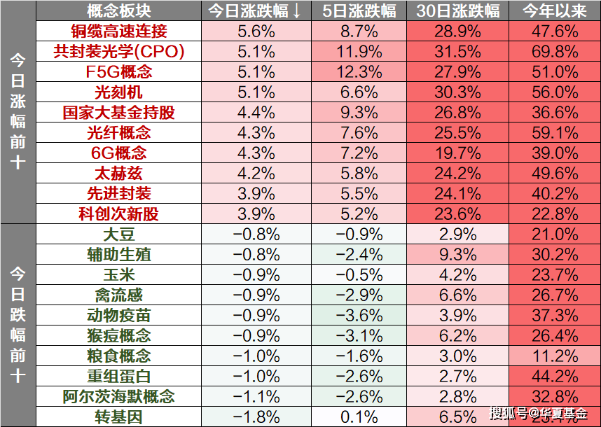 概念主题上看,铜缆高速连接、共封装光学(CPO)、F5G概念等板块上涨,转基因、阿尔茨海默概念、重组蛋白板块下跌。